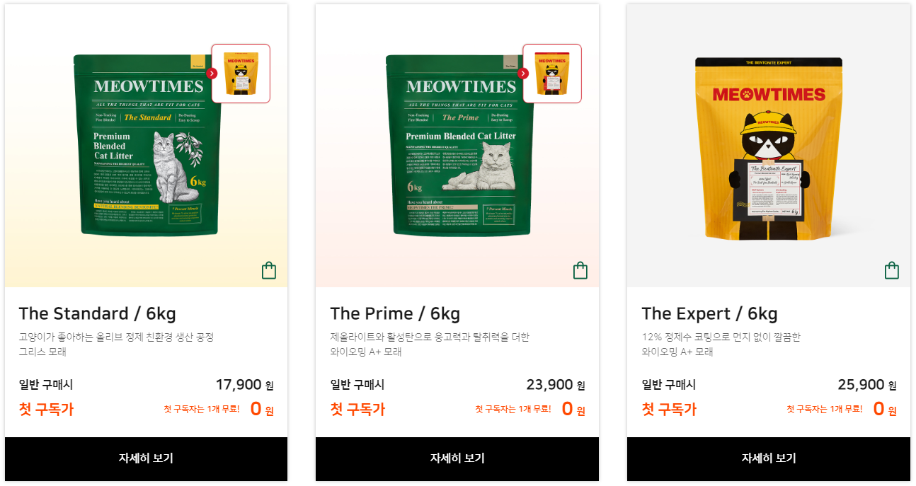 미우타임즈에서는 고양이들을 위한 다양한 제품을 구입하실 수 있는데, 그중 많은 분들이 찾고 계신 것이 바로 고양이 모래로 현재 구독을 신청하시면 첫 달은 무료로 받아보실 수 있습니다.