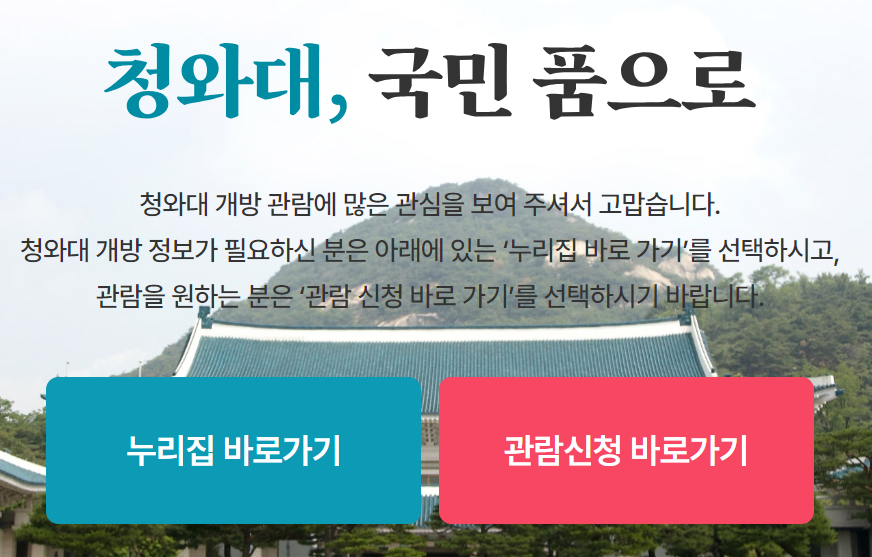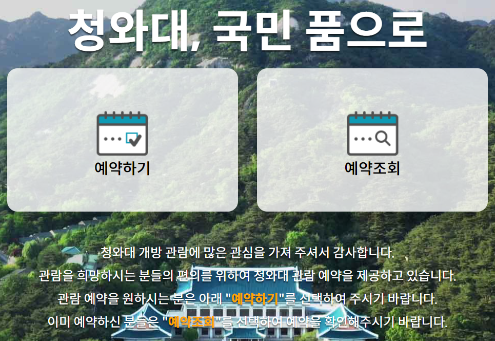 청와대 관람 신청은 청와대 홈페이지에서 하실 수 있습니다.