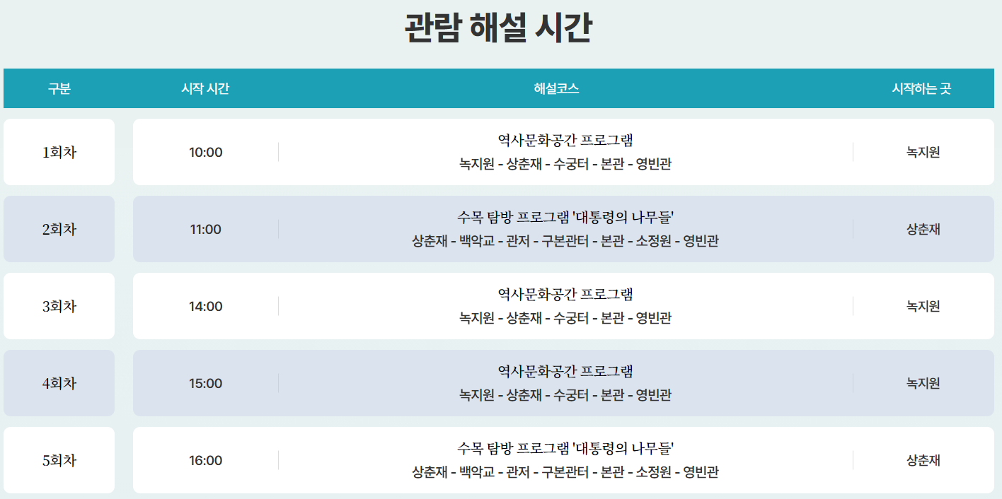 청와대에는 2가지 프로그램이 있는데 해설 프로그램과 수목 탐방 프로그램이 있습니다.