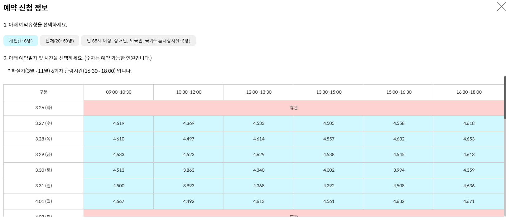 관람 신청은 개인당 최대 6명까지 예약이 가능하고 단체 예약은 20명부터 가능합니다.